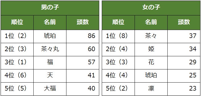 漢字で表記される名前では、男の子部門で昨年2位の「琥珀」が1位となりました。昨年は1位に1頭差の2位でしたが、今年は2位に26頭差をつける、堂々のトップとなりました。女の子部門では昨年8位の「茶々」がトップに。2022年のランキング以来、2年ぶりに1位に返り咲きました。