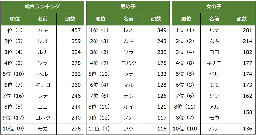 女の子部門では、昨年トップの「ルナ」が今年も1位を獲得し、2連覇でした。2位に「ムギ」、3位に昨年4位の「ココ」が入りました。女の子部門で昨年のトップ10圏外からランクインしたのは、8位の「メル」(昨年11位)だけで、昨年人気の名前が今年も引き続き人気を維持しています。