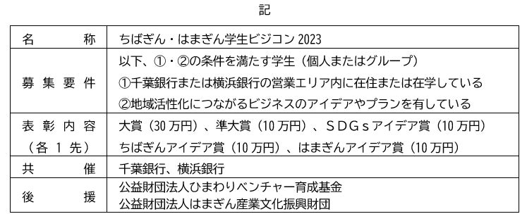 千葉銀行(頭取 米本 努)は、横浜銀行(頭取 片岡 達也)との共催による「ちばぎん・はまぎん学生ビジコン2023」の選考の結果、別紙の通り、受賞者を決定しましたのでお知らせします。