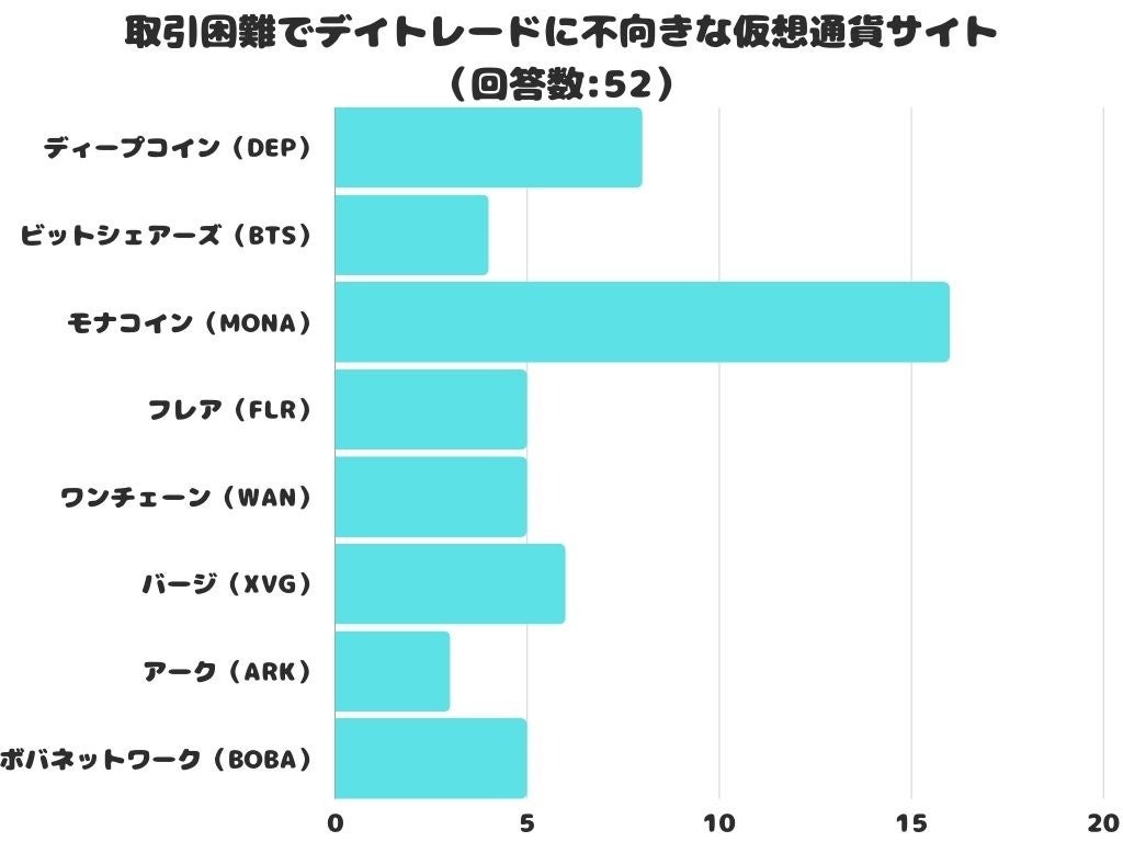 取扱取引所が少ない!?取引困難でデイトレードに不向きな仮想通貨をアンケートにて調査したところ、1位は「モナコイン(MONA)」でした。