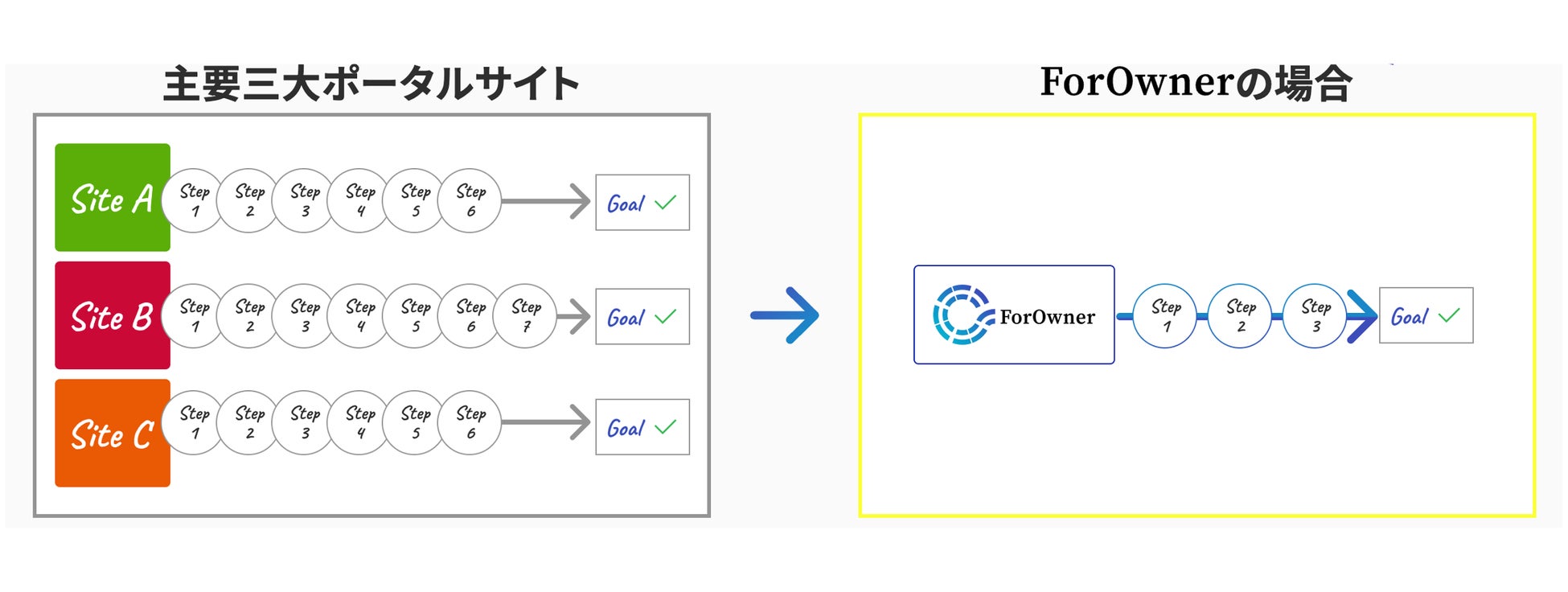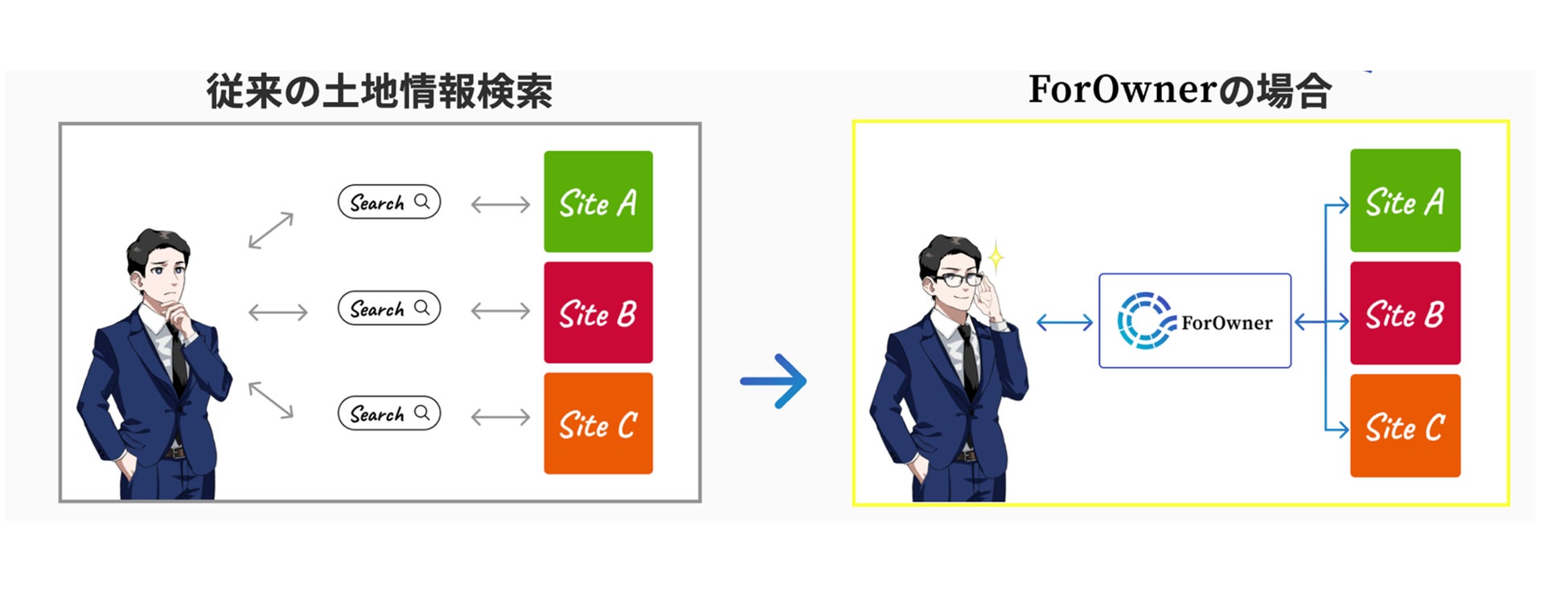 従来の土地情報検索では各ポータルサイトでそれぞれ行う必要がありましたが、『ForOwner』では主要ポータルサイトの土地情報を一括で検索することができます。また、ポータルサイトごとに異なっていた検索条件や表示形式も統一できるだけでなく、独自指標を付与した横断検索も可能です。