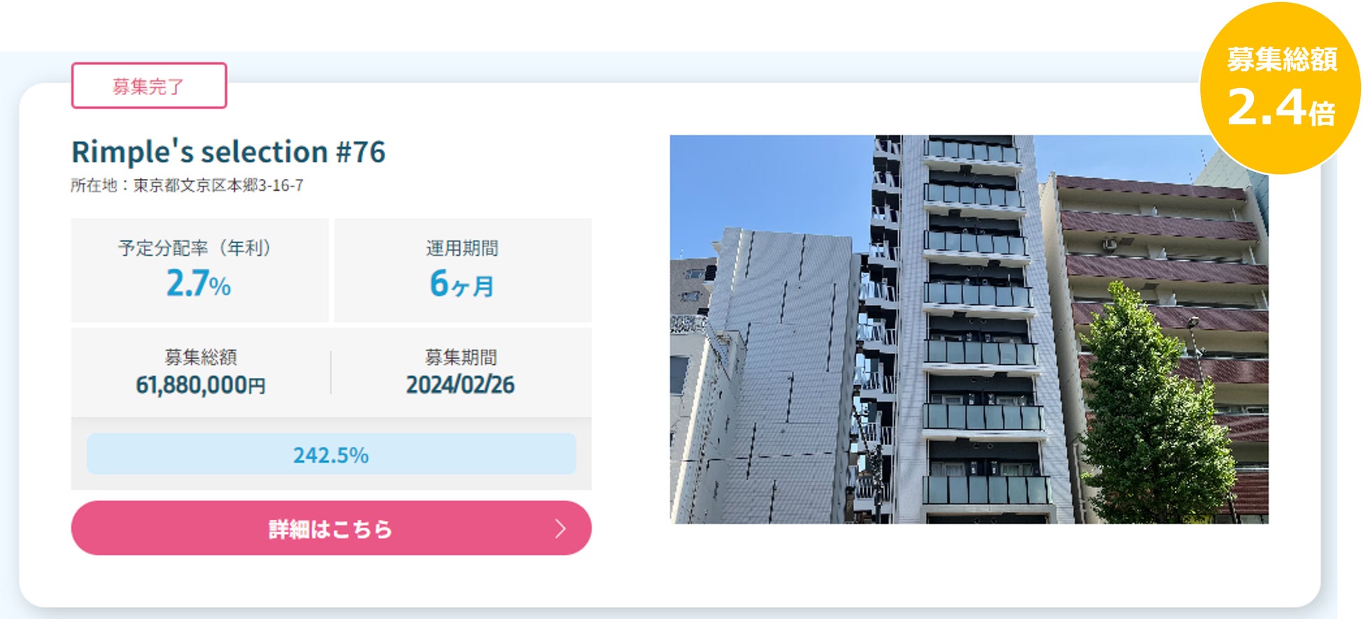 プロパティエージェントの展開する不動産クラウドファンディング「Rimple」Rimple’s Selection#76 募集総額242.5%の1.5億円の応募