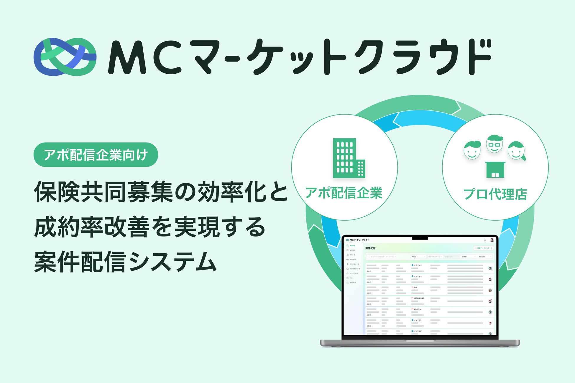 MCマーケットクラウドは、保険共同募集の効率化と成約率改善を実現する、アポ配信企業向けの案件配信システムです。これまで100社以上の保険代理店と共同募集をしてきたマネーキャリアのノウハウをもとにした、圧倒的な使いやすさと独自の専門家スコア機能・分析機能が備わっており、業務効率と成約率の課題を同時に解決します。