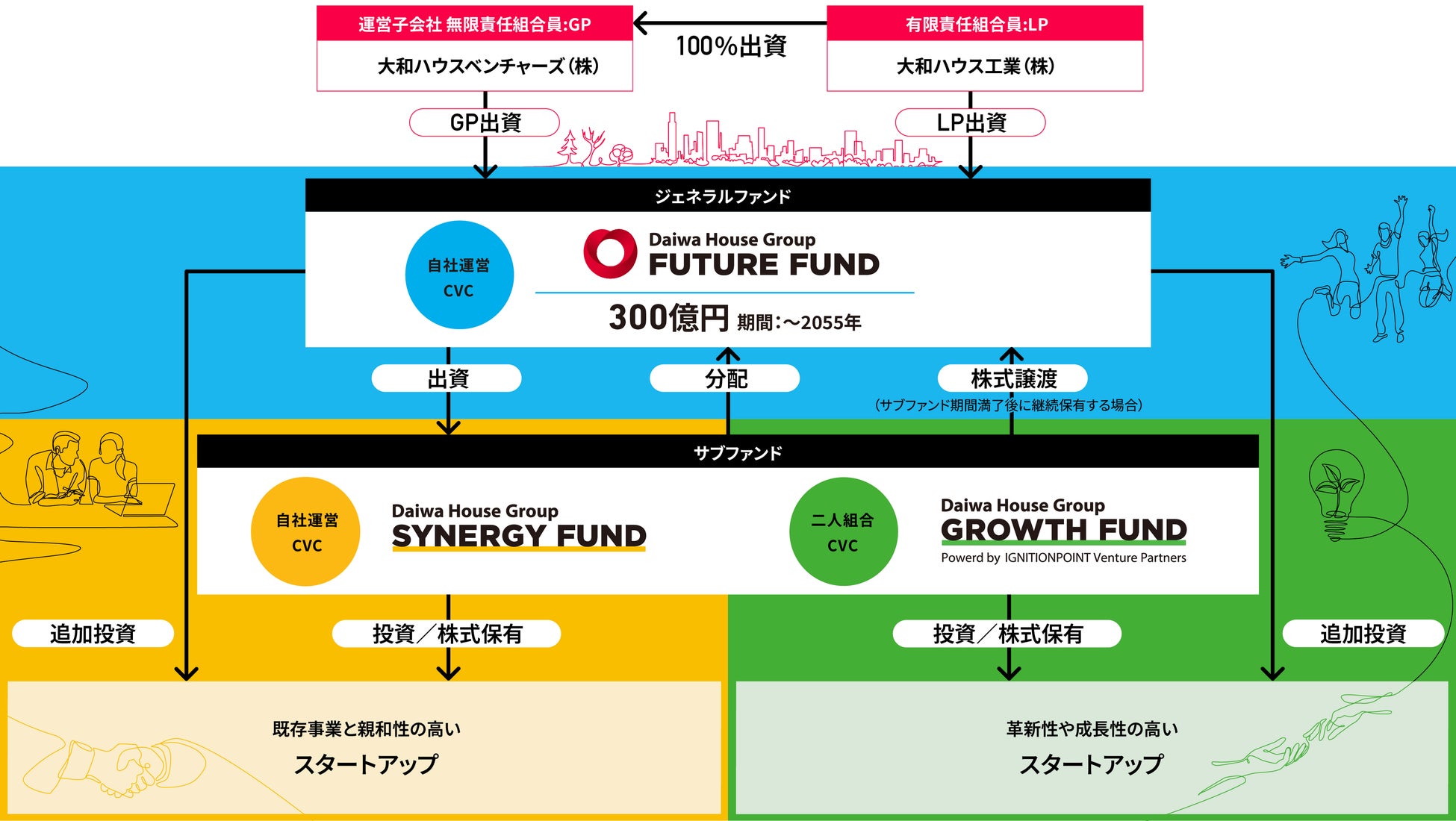 出資関係:大和ハウスグループ投資事業有限責任組合(99%)イグニション・ポイントベンチャーパートナーズ株式会社(1%)