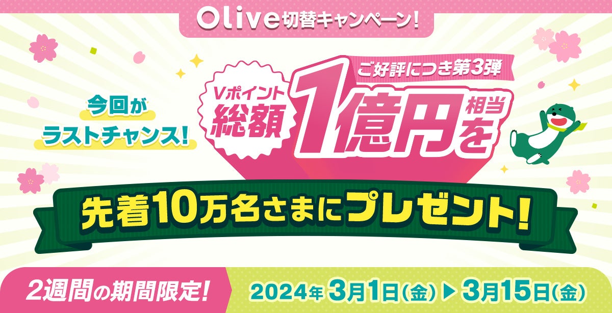 株式会社三井住友銀行(頭取CEO:福留 朗裕、以下「三井住友銀行」)は、既に三井住友銀行をご利用されているお客様へ日頃のご愛顧に感謝を込めて「~総額1億円相当のVポイントを先着10万名さまにプレゼント!~Olive切替キャンペーン第3弾」を2024年3月1日(金)から2024年3月15日(金)の期間限定で実施いたします。