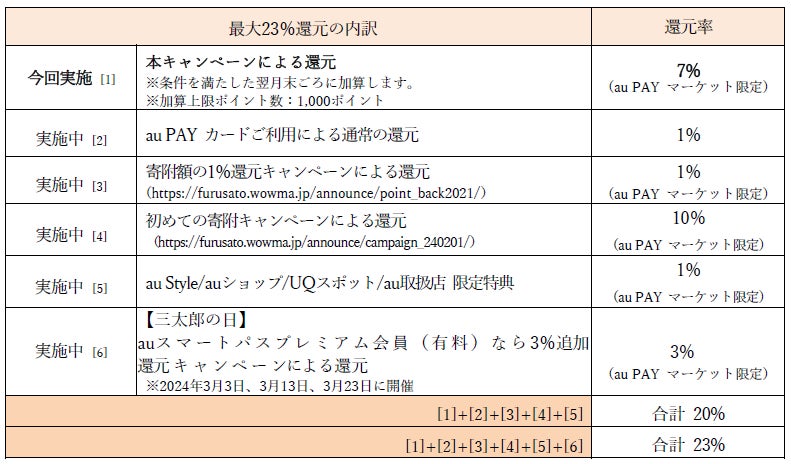 キャンペーン期間中にエントリーの上、au PAY カードを利用してau PAY ふるさと納税で寄附いただくと、寄附額に対して最大7%のPontaポイント(au PAY マーケット限定)を還元します。実施中の各キャンペーンや特典とあわせると合計最大23%のポイントを還元します。