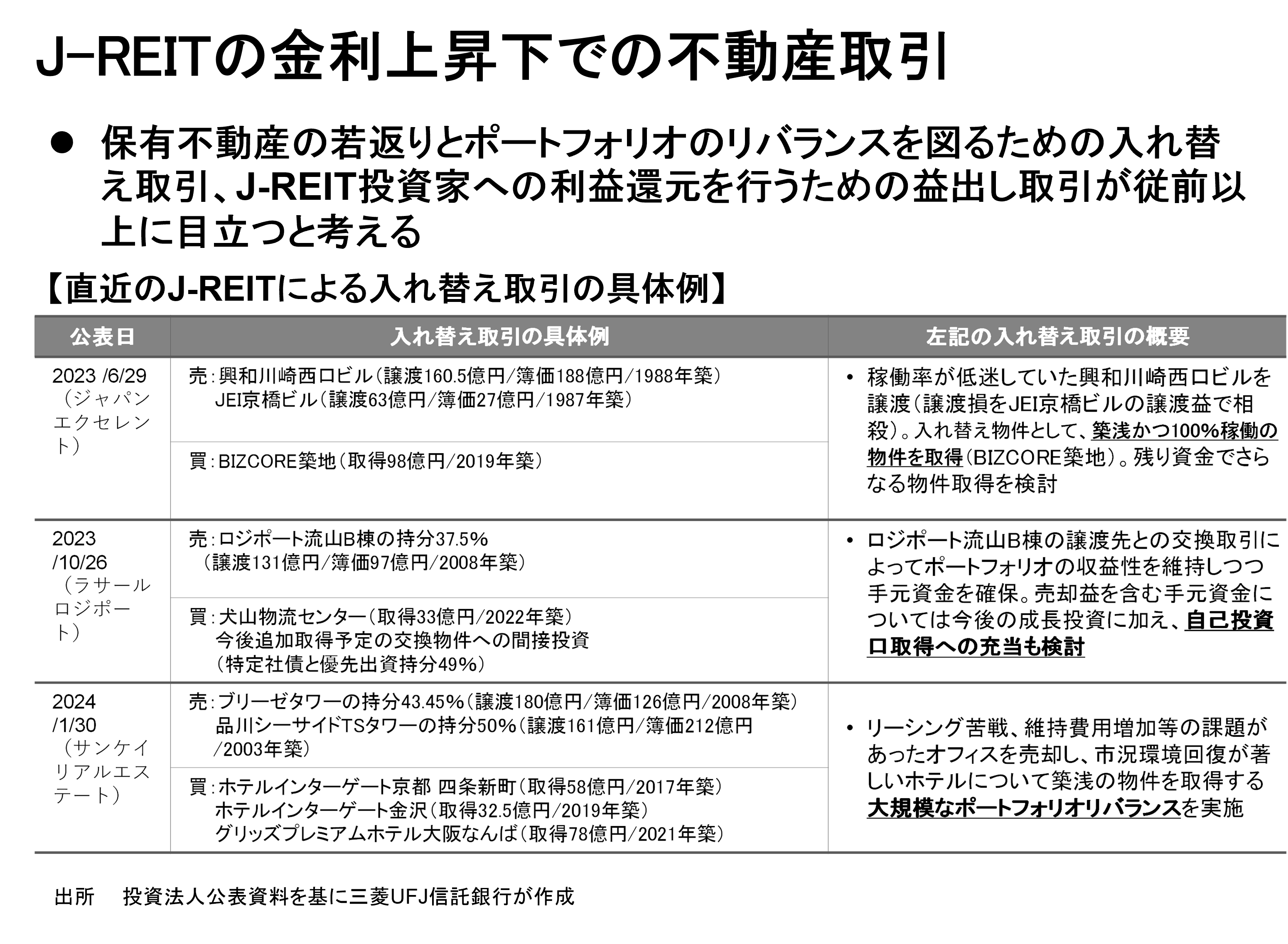 実物不動産市場の相対的な値付けが高いなか、J-REITによる保有不動産の若返りやポートフォリオのリバランスを目的とした入れ替え取引、J-REIT投資家への利益還元を目的とした益出し取引が従前以上に目立つだろう