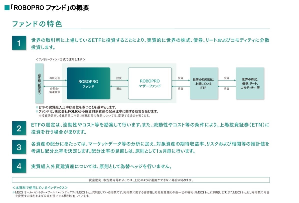 今回SBI証券のインターネットコースでの取扱いが開始されることで、SBI岡三アセットマネジメント、FOLIO、SBI証券のSBIグループ3社が総力を結集した「ROBOPROファンド」を通じて、さらに多くの投資家の皆様にロボアド運用のメリットを享受していただけるものと考えています。