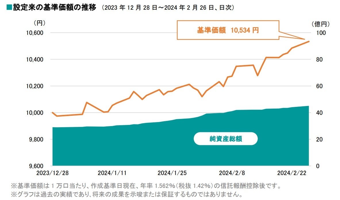 当ファンドは、運用を開始して約2ヵ月が経過し、基準価額は10,534円(2024年2月26日時点)、純資産総額は約45億円となっており、順調な滑り出しを見せています。