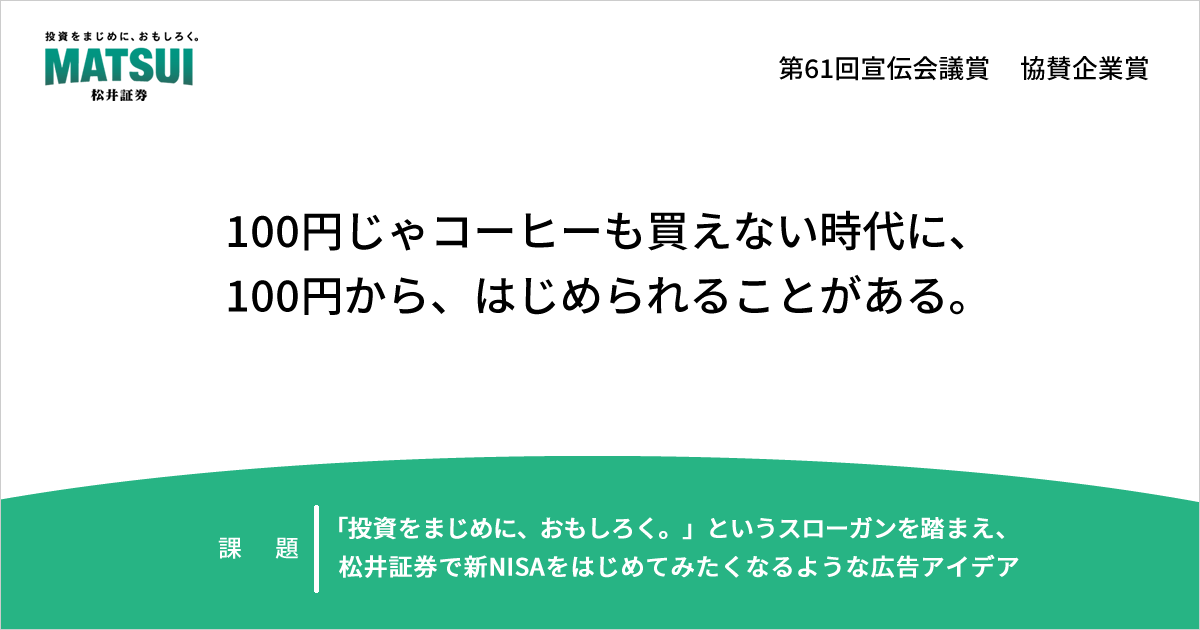 第61回「宣伝会議賞」では、「松井証券で新NISAをはじめてみたくなるような広告アイデア」を一般募集し、多数の応募作品の中から協賛企業賞を「100円じゃコーヒーも買えない時代に、100円から、はじめられることがある。」に決定しました。