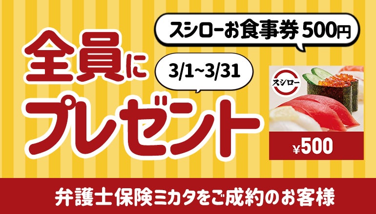 対象期間中に弁護士保険STATION経由で、ミカタ少額短期保険株式会社「弁護士保険ミカタ」の契約申込を完了し、ご契約が成立されたお客様全員に「スシローお食事券 500円」をプレゼントします。