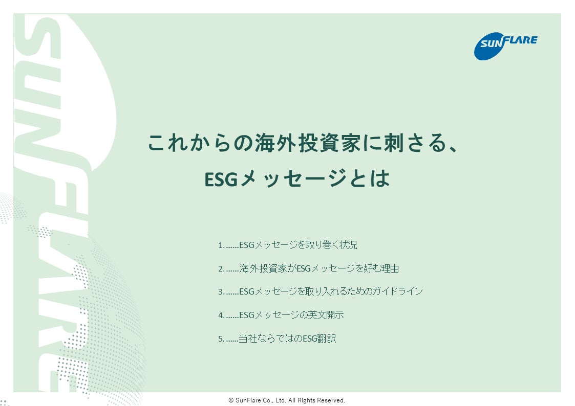 英文開示が義務化され、ますます企業に対し海外投資家を呼び込む情報開示が求められております。こちらのホワイトペーパーでは、企業がESGメッセージを発信する重要性や海外投資家向けのポイントなどが翻訳会社の視点でまとめられており、英文開示の準備を進めるIRや広報担当者等には必見の情報となっております。