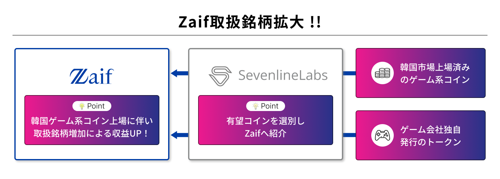 本提携により、「Zaif」は、韓国のゲーム市場に精通するSevenlineLabs を通じて、韓国の有力ゲームタイトルコインの紹介を受け、Zaif に上場することで収益アップを図ります。