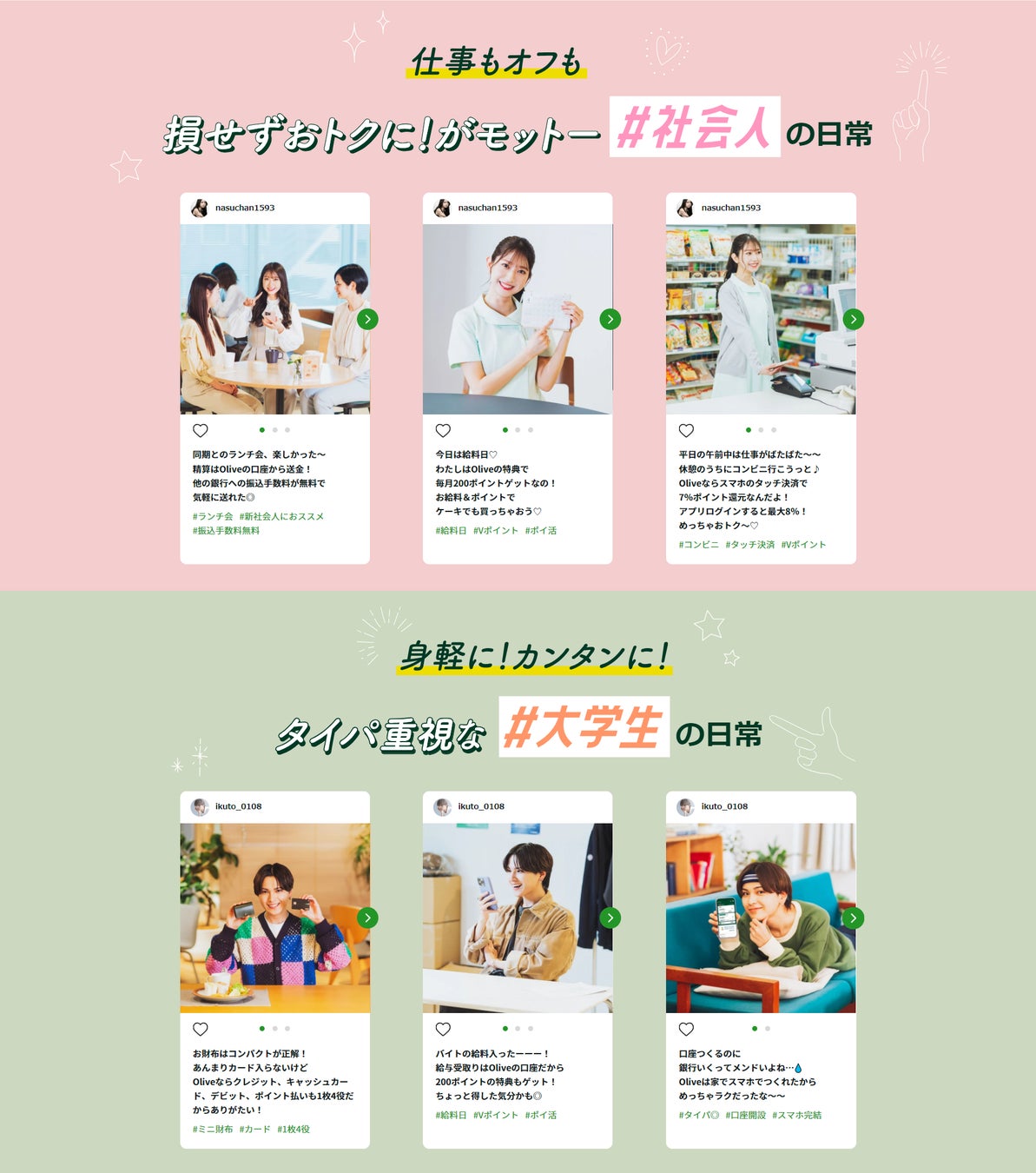 3月に口座開設を検討する新社会人や大学生に向けて、実際のOliveユーザーとして社会人「なすちゃん」と、大学生「菅生育利さん」がOliveを使った日常をSNS風に紹介しています。写真をスライドしていくと、詳しい解説があるため楽しくOliveの機能や特典を学べるコンテンツとなっています。
