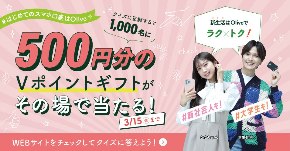 2024年3月5日(火)15:00~2024年3月15日(金)23:59の期間限定で、サイトを見てクイズに答えると1,000名に500円相当のVポイントギフトが当たるキャンペーンも実施中です。