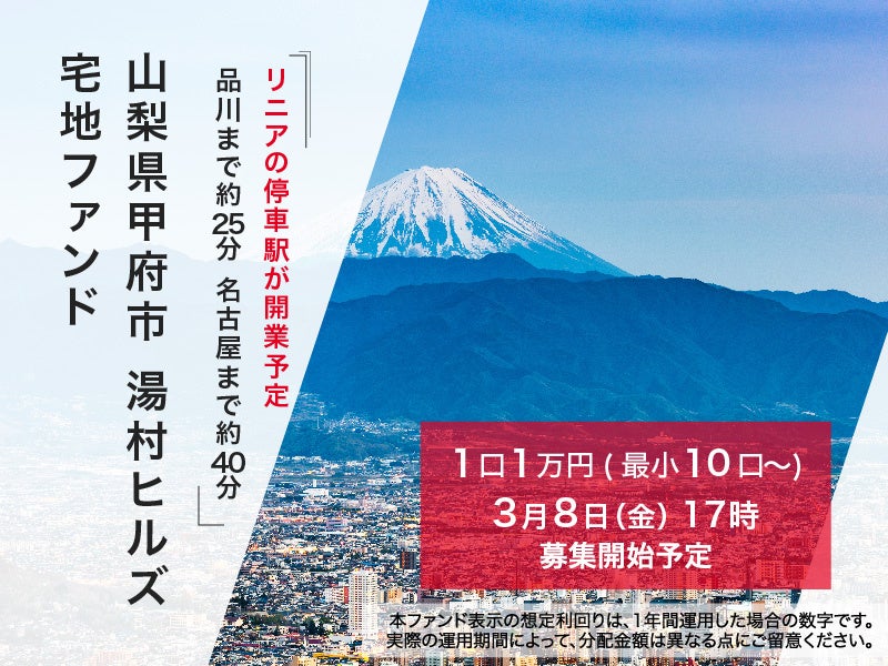甲府市では、2027年以降に開業予定である「リニア中央新幹線」の停車駅建設が計画(*1)されており、都心から訪れる国内外の観光客による交流人口の増加や新たな企業立地による雇用の創出、豊かな自然などの魅力発信による移住・定住の促進につながることが期待されています。当社においても、本ファンドを通じた地域活性化への貢献を期待しています。