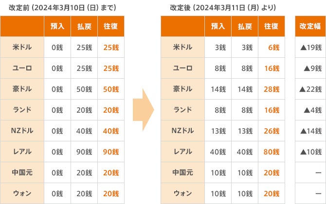 本改定では、auじぶん銀行で取り扱いのある8通貨中、6通貨(米ドル、ユーロ、豪ドル、ランド、NZドル、レアル)の為替手数料の引き下げを実施します。なかでも、米ドルの為替手数料は、往復6銭(預入時3銭、払戻時3銭)となり、業界最低水準(注) を実現します。これにより、以前よりもコストを抑えて外貨預金をお取引していただけるようになります。