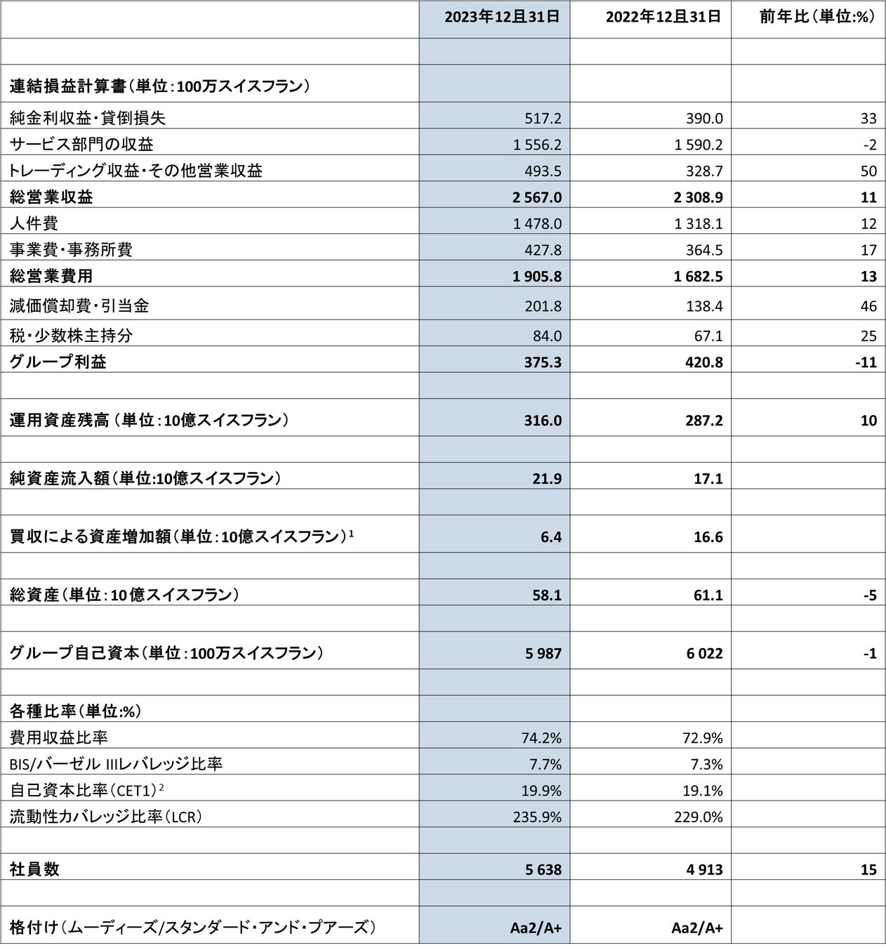 グループの2023年の総営業収益は11%増の25億7,000万スイスフランとなりました。サービス部門の収入は、仲介事業からの収入減と成功報酬の減少により、前年比でわずかに減少し(-2% )、15億6,000万スイスフランとなりました。純金利収益は、良好な金利環境と積極的なバランスシート管理を反映し、33%増の5億1,720万スイスフランとなりました。トレーディング収益およびその他営業収益は、債券ポートフォリオの評価益と外国為替取引を主因として、50%増の4億9,350万スイスフランとなりました。