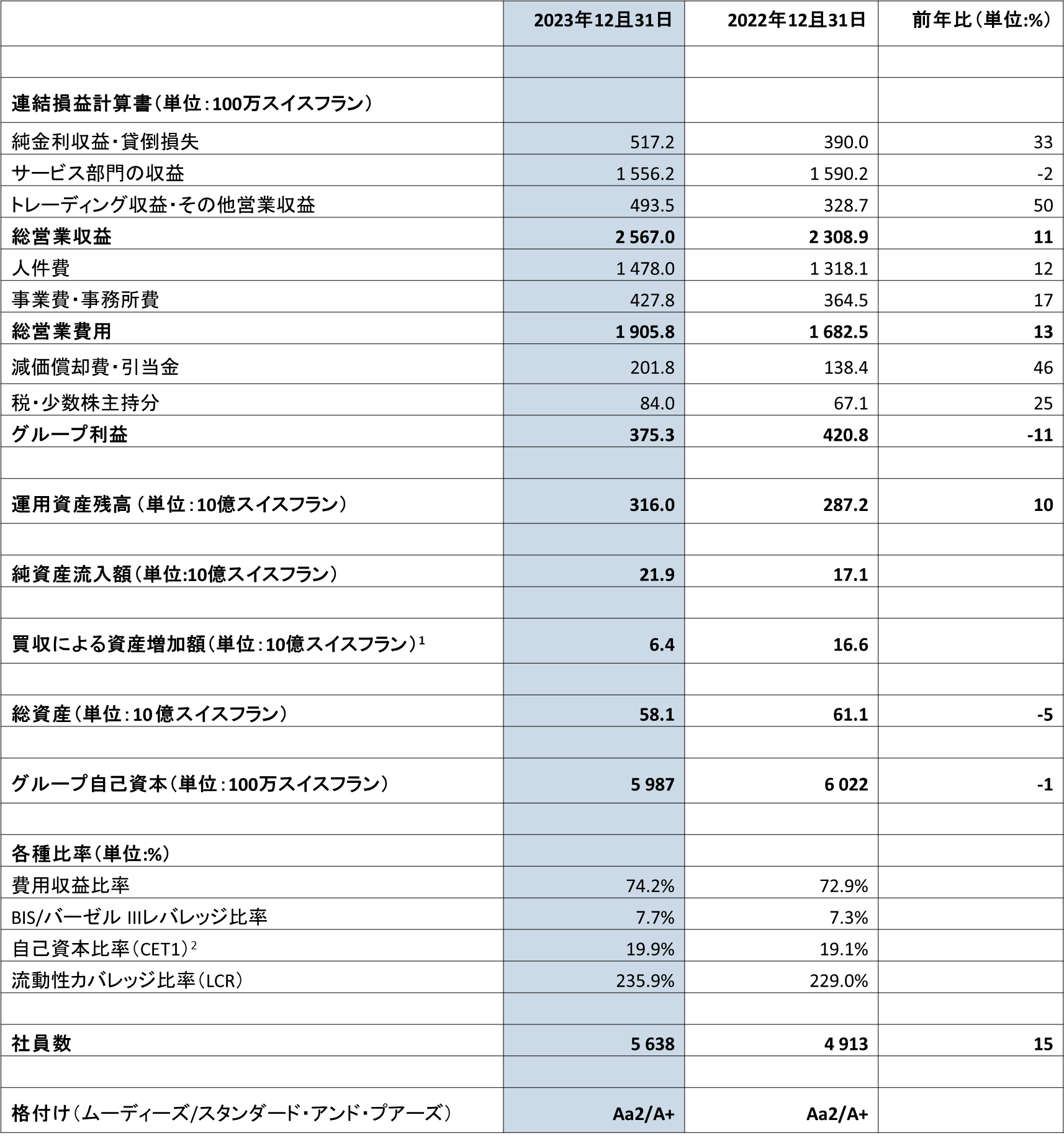 グループの2023年の総営業収益は11%増の25億7,000万スイスフランとなりました。サービス部門の収入は、仲介事業からの収入減と成功報酬の減少により、前年比でわずかに減少し(-2% )、15億6,000万スイスフランとなりました。純金利収益は、良好な金利環境と積極的なバランスシート管理を反映し、33%増の5億1,720万スイスフランとなりました。トレーディング収益およびその他営業収益は、債券ポートフォリオの評価益と外国為替取引を主因として、50%増の4億9,350万スイスフランとなりました。