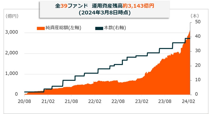 昨今の半導体関連銘柄に牽引された日経平均株価の最高値更新や、新NISAに伴う個人投資家の投資機運の高まりが追い風となり、今回の運用資産残高3,000億円の突破となりました。