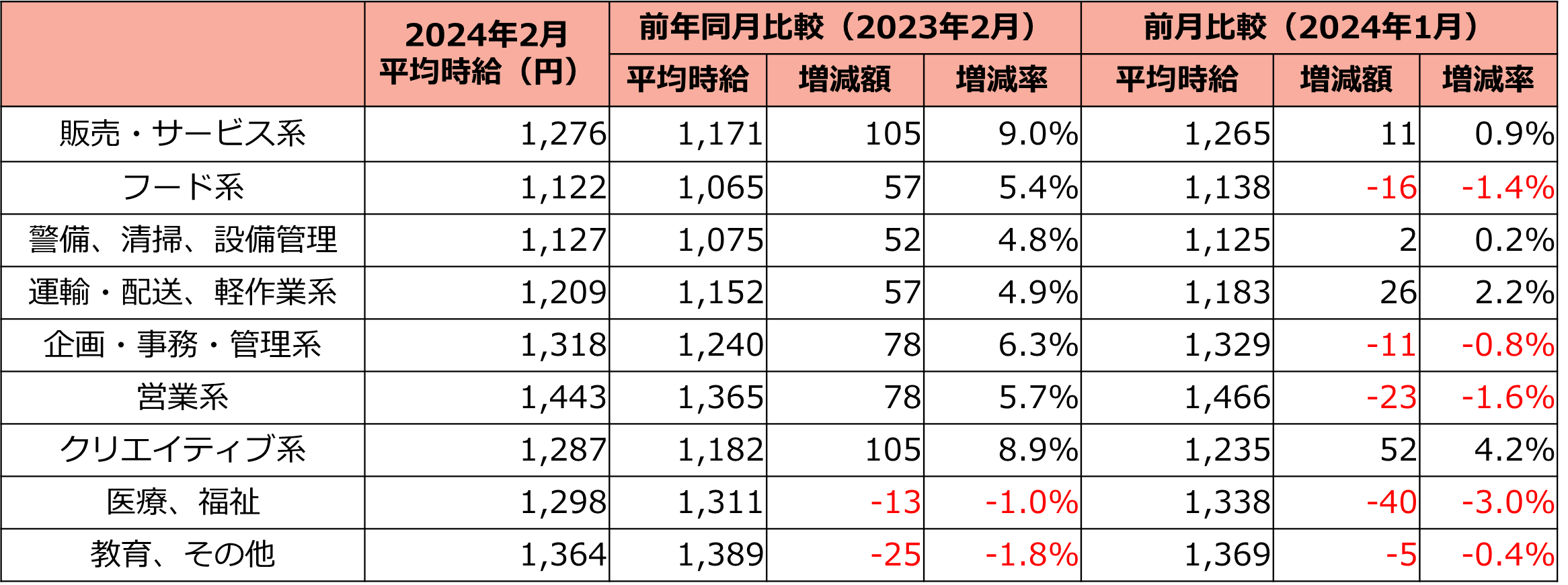 2月度の、三大都市圏 職種別平均アルバイト時給は【医療、福祉】【教育、その他】以外で前年同月比プラス。