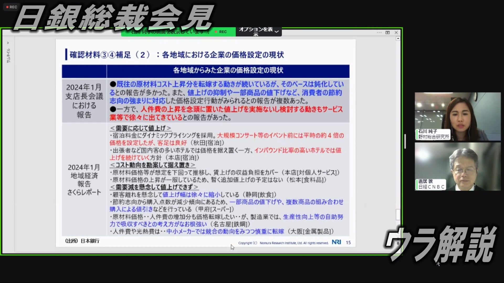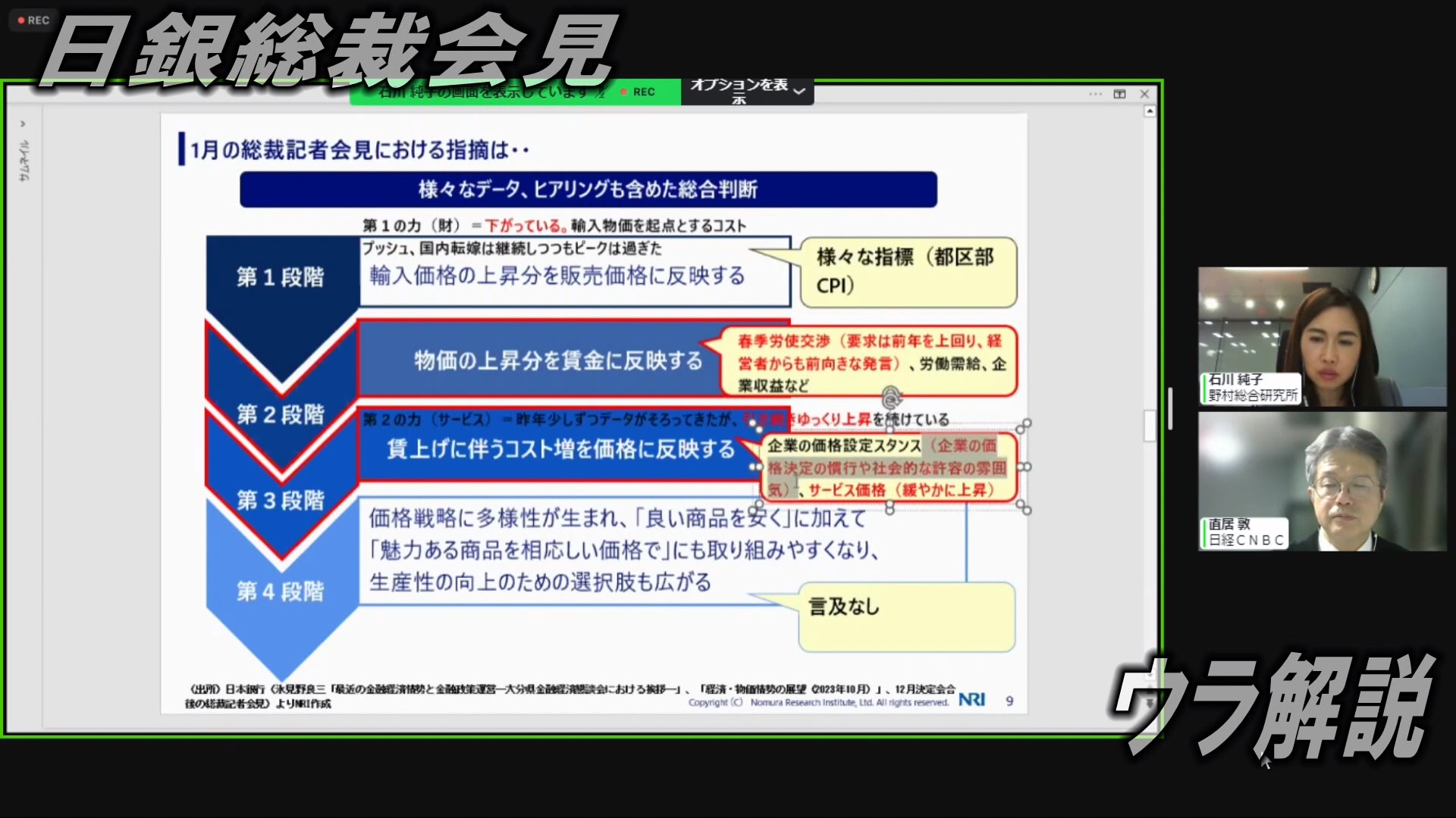植田総裁の発言内容や記者の質問意図について、Zoomのチャット機能を使ってリアルタイムで解説。