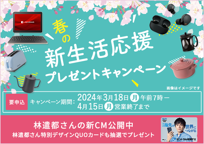 以下の条件をすべて満たされた方の中から、取引数量に応じて抽選で50名様に「ノートパソコンdynabook K2」や「ソニー ワイヤレスノイズキャンセリングステレオヘッドセット」、「カタログギフト」をプレゼントします。さらに新CM公開を記念して、抽選で100名様に「林遣都さん特別デザインQUOカード」をプレゼントします。