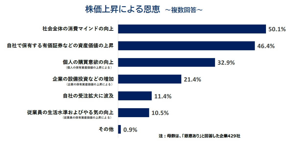 具体的な恩恵としては、「社会全体の消費マインドの向上」(50.1%)が最も高くなった(複数回答、以下同)。次いで、直接的な恩恵である「自社で保有する有価証券などの資産価値の上昇」が46.4%、「個人の購買意欲の向上」が32.9%で続いた。