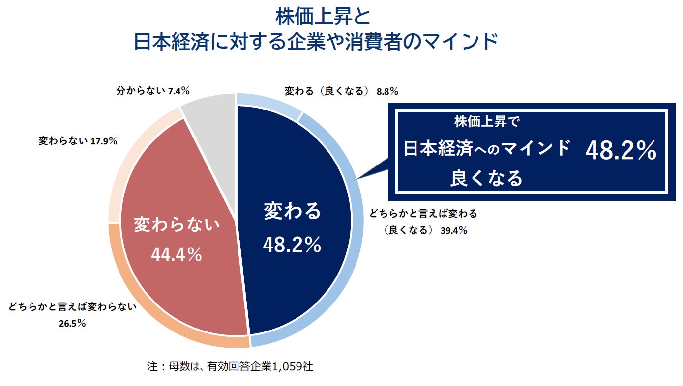 本アンケートの結果、昨今の大幅な株価の上昇で、約半数(48.2%)の企業が日本経済に対する企業や消費者のマインドが良くなると捉えていることが分かった。また4割超の企業で、消費マインド向上や資産価値の上昇など直接・間接的な恩恵を受けると見込んでいる。