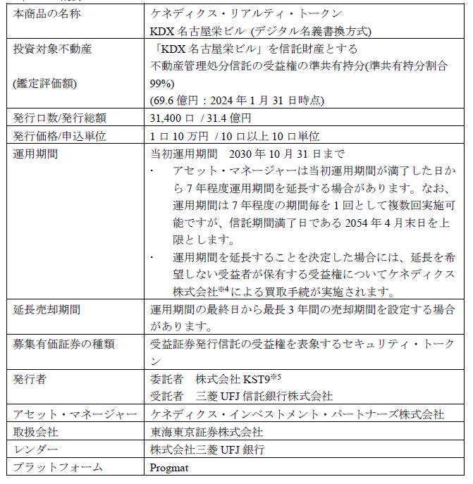 ケネディクス株式会社(代表取締役社長:宮島 大祐、以下「ケネディクス」)、三菱UFJ信託銀行株式会社(取締役社長:長島 巌、以下 「三菱UFJ信託銀行」)、及び東海東京証券株式会社(代表取締役社長:北川 尚子、以下「東海東京証券」)は、Progmat, Inc.(代表取締役:齊藤 達哉、以下「Progmat社」)がライセンス提供するデジタルアセット発行・管理基盤「Progmat※1」(プログマ)を活用した、不動産セキュリティ・トークン※2(以下「本ST」)の公募に関して協業し、この度、募集・発行が完了いたしました。