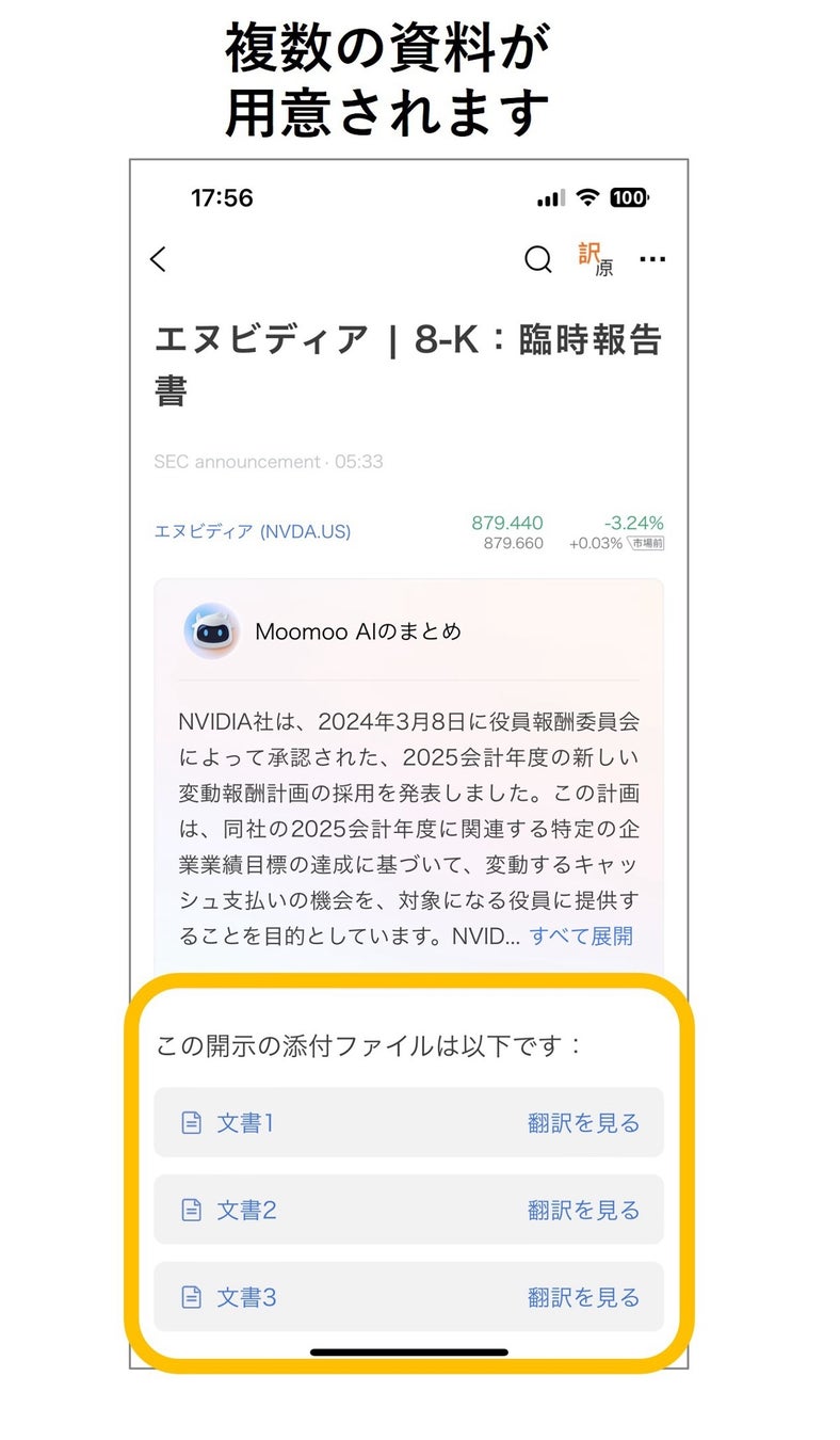 テンプのファイル資料がある場合など複数の文書を処理する場合でも「Moomoo AI」で多数の文書から要点をすぐに選び出すことが可能です。