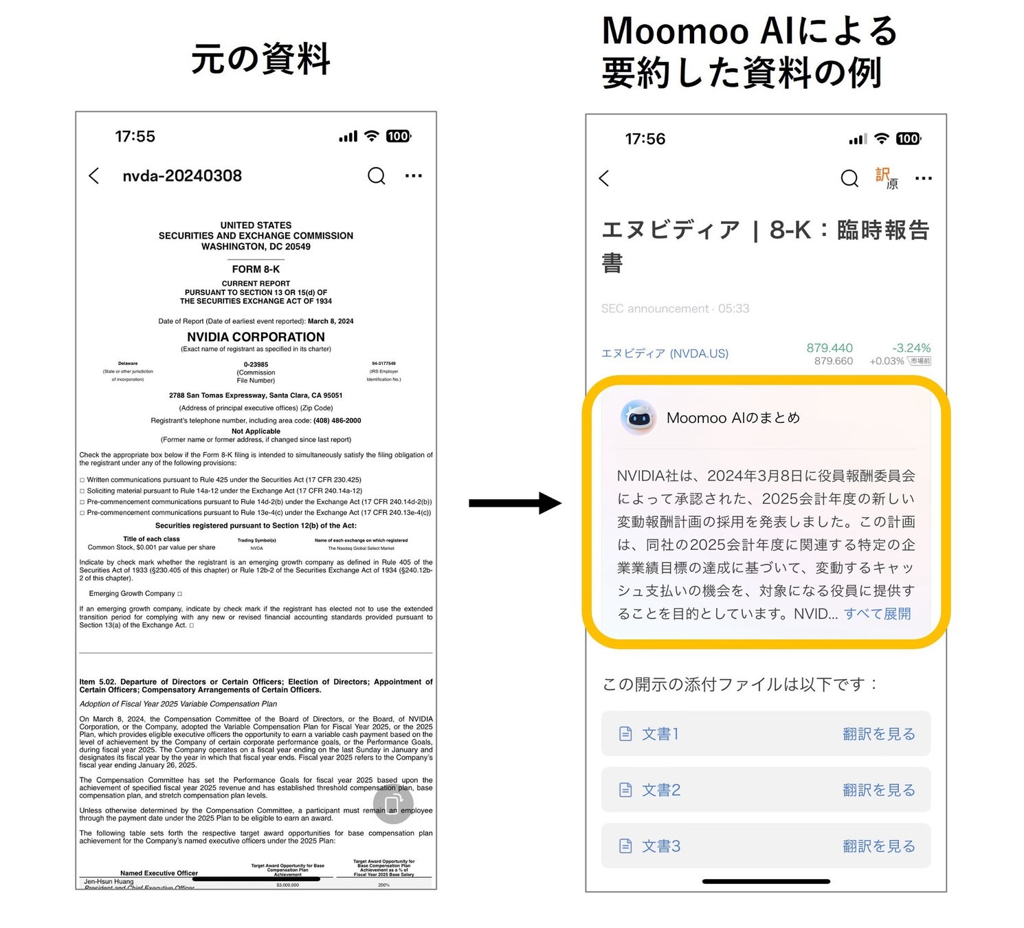 そこで、moomoo証券は、より迅速かつ正確に投資に関する情報をつかみ、件名な投資判断を下すために、moomooアプリ内に「Moomoo AI」というAIによる文書の要約機能を導入しました。この機能により、多くのニュースの要旨を自動でまとめ、手短な日本語[梓前1] で把握できるようになります。