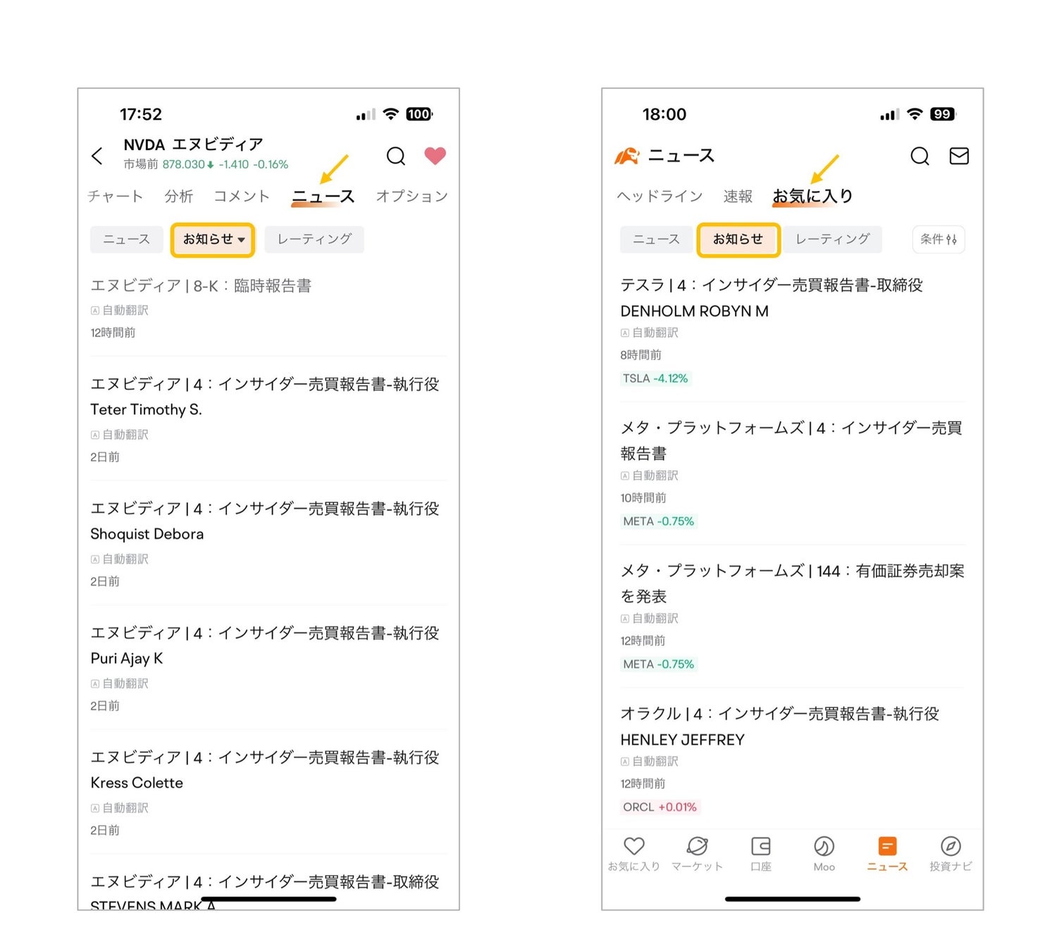 1. ニュース > お気に入り > お知らせ(下の図の左側を参照ください)