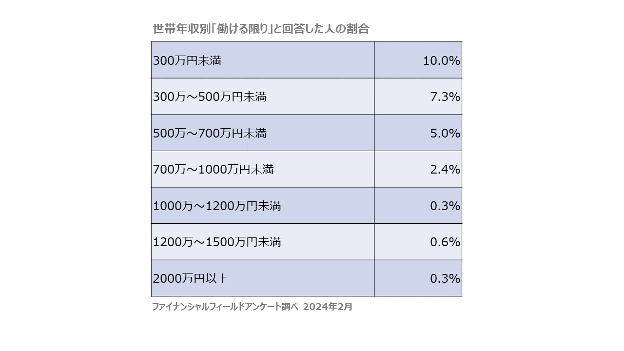 また、世帯年収別で「働ける限り働く」と回答した方の割合を見てみると、「世帯年収300万円未満」では約10%、「世帯年収2 000万円以上」では約0.3%と、世帯年収が高いほど「働ける限り働く」と考えている人が少ないという結果でした(小数点第二位は四捨五入するものとする)。