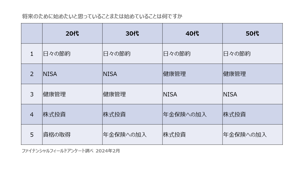 また、「将来のために始めたいと思っていることまたは始めていることは何ですか」と質問したところ、各年代の上位5項目を比較すると、全体の1位は「日々の節約」でしたが、年代別で見ると20代・30代の2位、40代・50代の3位に「NISA」が入りました。年代により多少の優先順位の差はありますが、投資に関する関心度が高いという結果になりました。