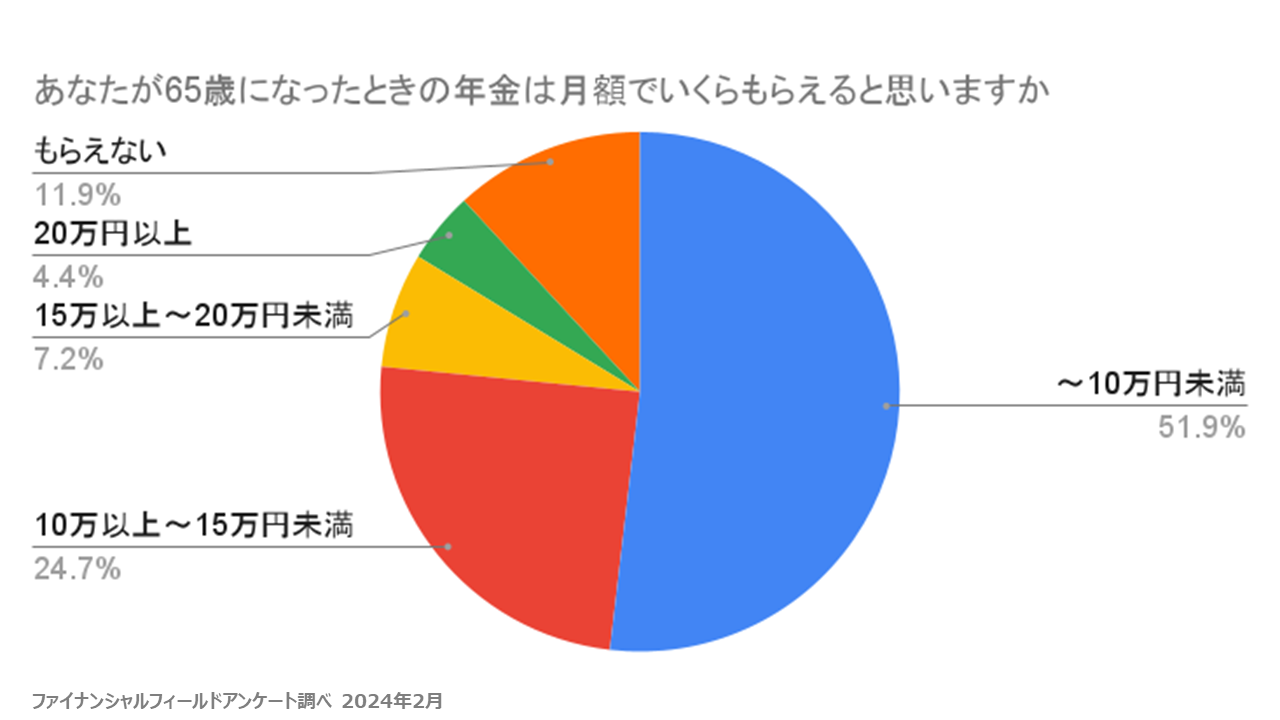 「65歳になった時の年金は月額どのくらいもらえると思いますか」と質問したところ、51.9%の方が10万円未満と回答しました。