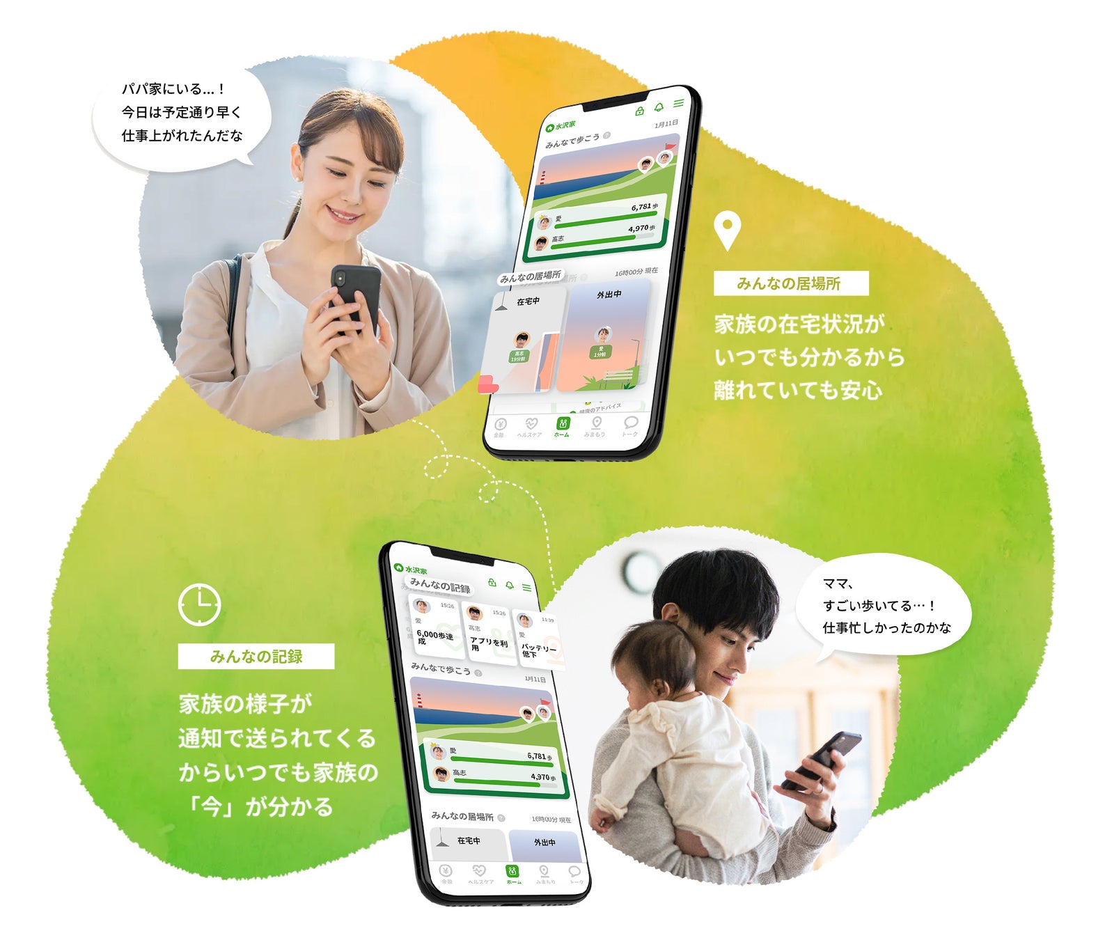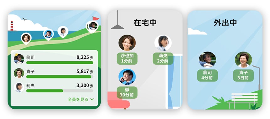 家族のその日の歩数をランキング形式で表示することで、離れた家族とのつながりを楽しく感じながらご利用いただくことができます。さらに、現在家族が家にいるのか又は外出中なのかをわかりやすいイラストで表示することで、簡単に家族の居場所を知ることができます。