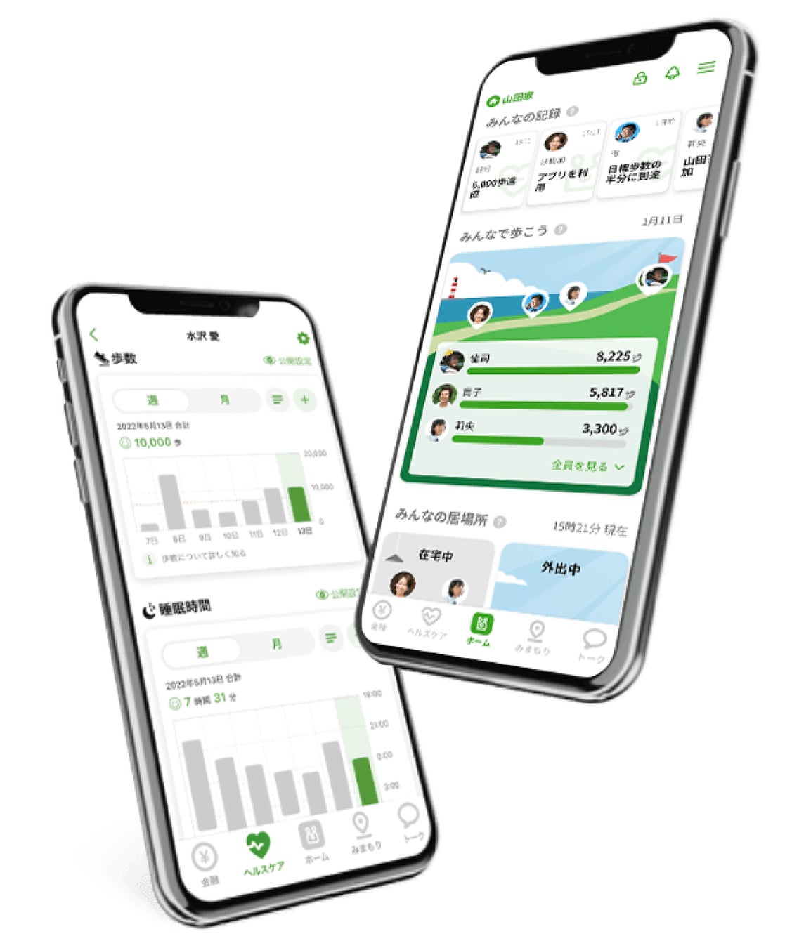 家族の歩数や在宅状況をビジュアル化して表示