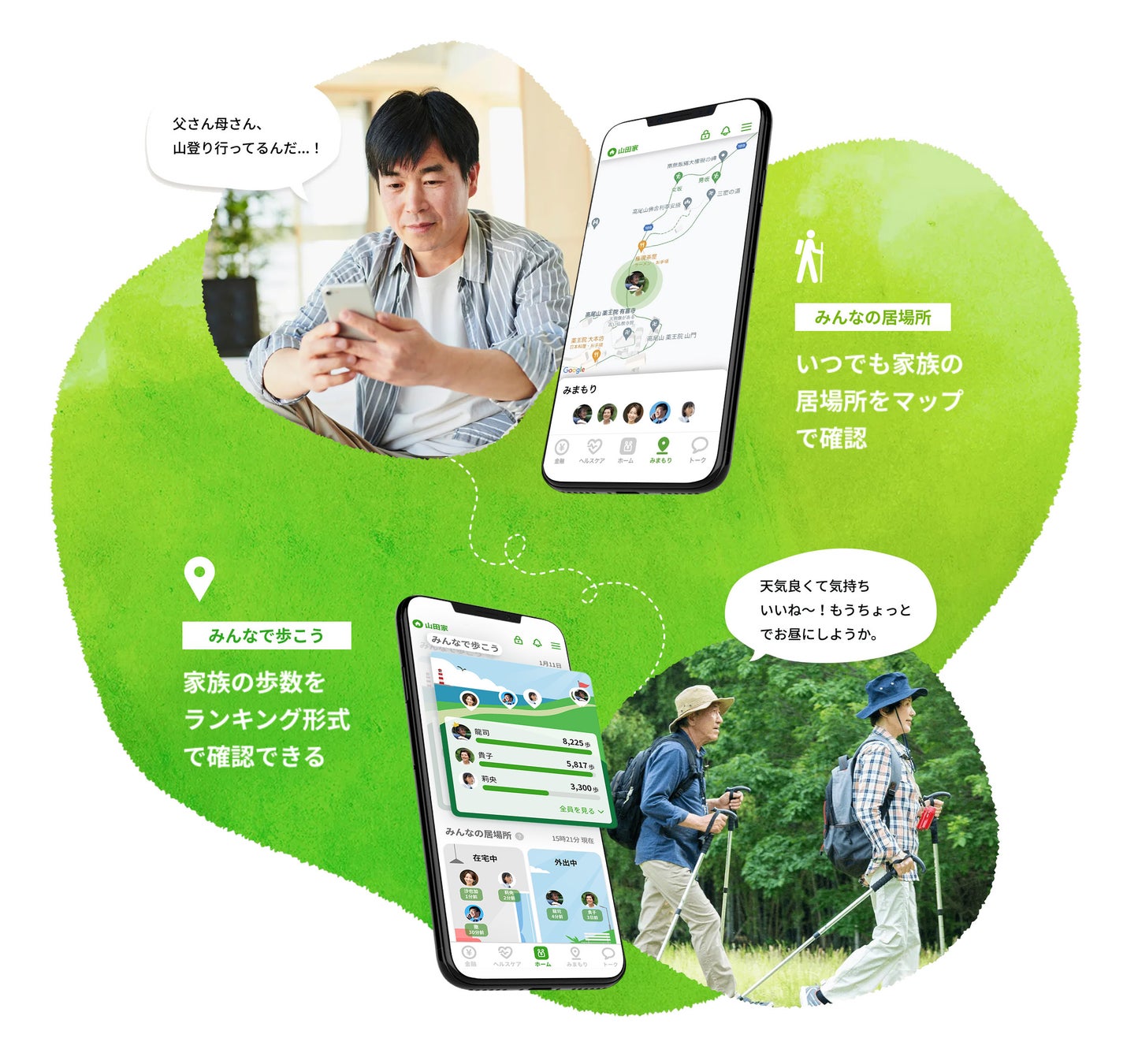 登録した家族の居場所を地図上で確認できるため、両親がどんな活動をしているのか、離れた場所にいてもいつでもわかります。家族の歩数をランキング形式で表示することもできるので、家族みんなで楽しみながら歩くこともできます。