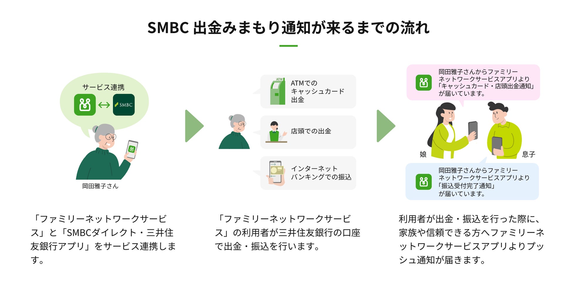 三井住友銀行に口座をお持ちの方はファミリーネットワークサービスと連携することで、口座から設定した金額以上の出金があった場合に、他の家族のスマートフォンにプッシュ通知でお知らせする「出金みまもり通知機能」をご利用いただけます。この機能により多額の出金や特殊詐欺などの被害があった場合等に、他の家族に気が付いてもらうことができます。