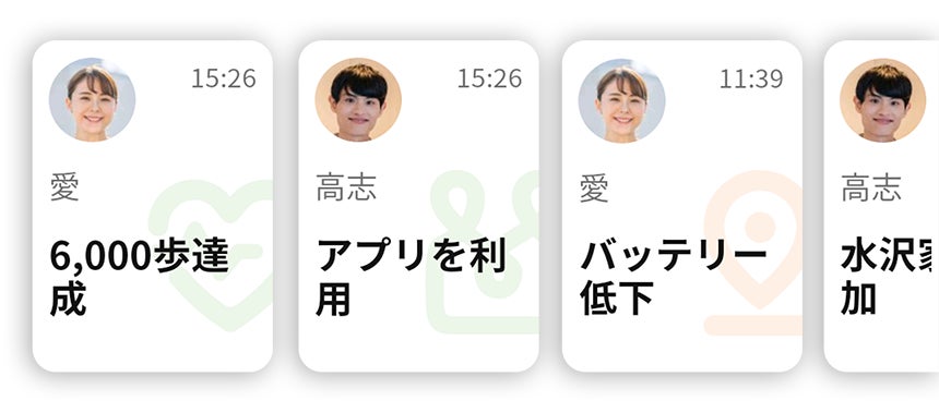 一緒にアプリを利用している家族がアプリを利用したタイミングやたくさん歩いたタイミング等に、家族の最新情報が表示されるタイムライン機能が追加されました。この機能により離れた家族の様子をアプリ上で簡単に感じることができるようになり、忙しい毎日の家族間のコミュニケーションをサポートします。