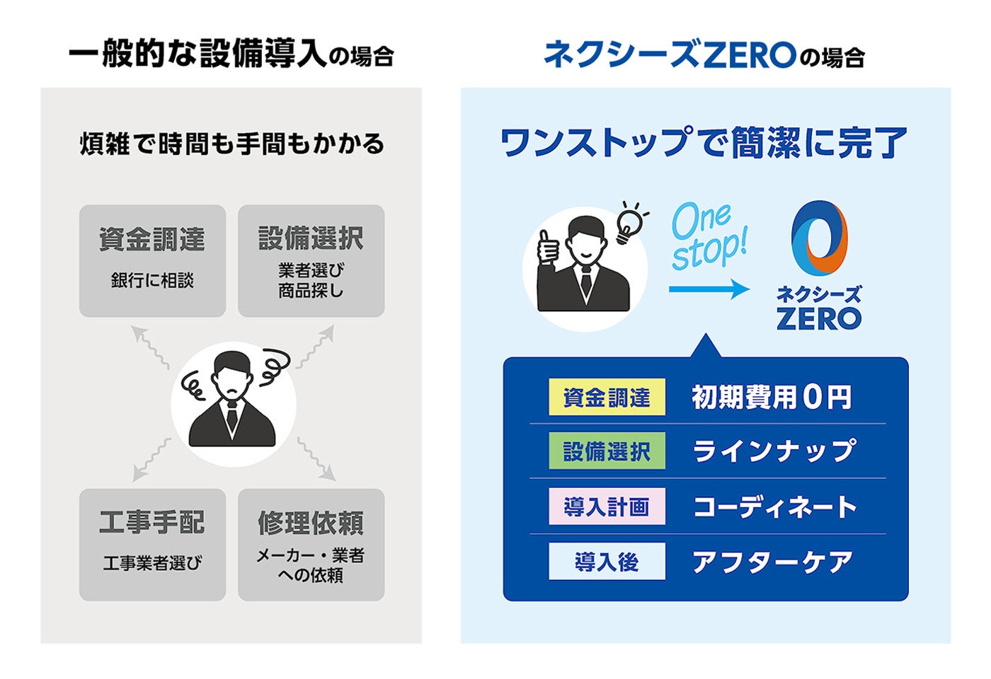 当社が提供する「ネクシーズZERO」は、LED照明をはじめとする省エネ設備を販売し、同時に購入にかかる資金調達を担うことで顧客の時間や手間の煩雑さを取り除く組込型金融(エンベデッド・ファイナンス)サービスです。