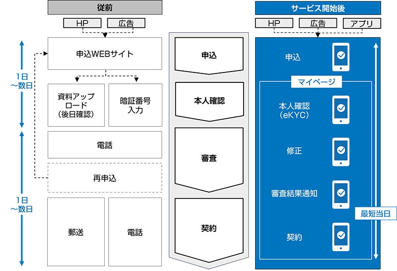(一社)全国銀行協会が2020年に行った「銀行カードローンに関する消費者意識調査」(※1)によると、利用者が銀行カードローンを運営する銀行に対して望むこととして、「資金が必要な時にスムーズに融資してくれること」(38.1%)、「借入や返済の利便性向上」(36.8%)などが挙げられています。一方で、多くの銀行カードローンはウェブで申し込みを受け付け後、電話による確認作業や郵送での契約など手間が多く、申し込みから入金まで数日を要しているのが現状です。