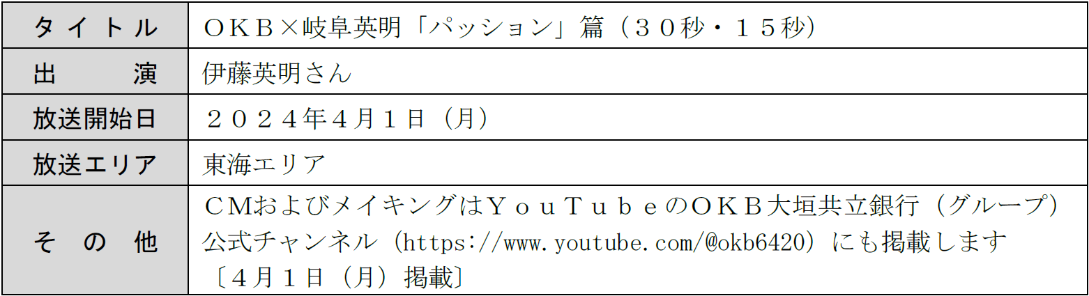 今回のコラボレーションは、“地域への想い”や“パッション(=情熱)”を原動力に、地域を盛り上げたいという両者の想いが一致したことにより実現しました。第一弾としてOKBのテレビCM「OKB×岐阜英明『パッション』」篇の放送を開始するほか、コラボレーションした広告をOKB店舗のショーウィンドウポスターなどで展開します。