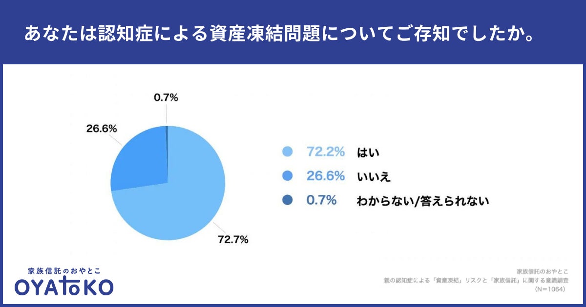 2023年に実施した45〜65歳の男女約1,000名へのアンケート調査(https://trinity-tech.co.jp/oyatoko/column/169/)によると、「あなたは認知症による資産凍結問題についてご存じでしたか」(N=1064)という質問に対し「はい」が72.7%、「いいえ」が26.6%という回答となった。