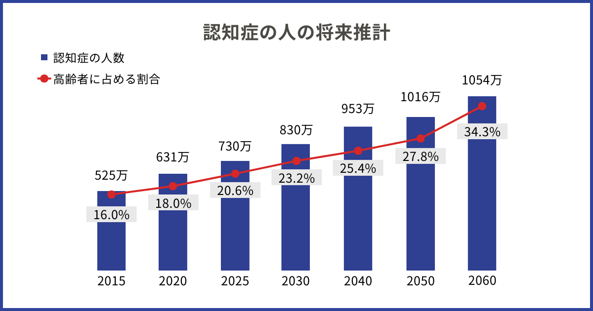 厚生労働省によると、2050年には人口約1億人に対し、高齢者が約3,800万人(人口対比約37.7%)、認知症患者が約1,000万人(同約10%)となる見込みである。