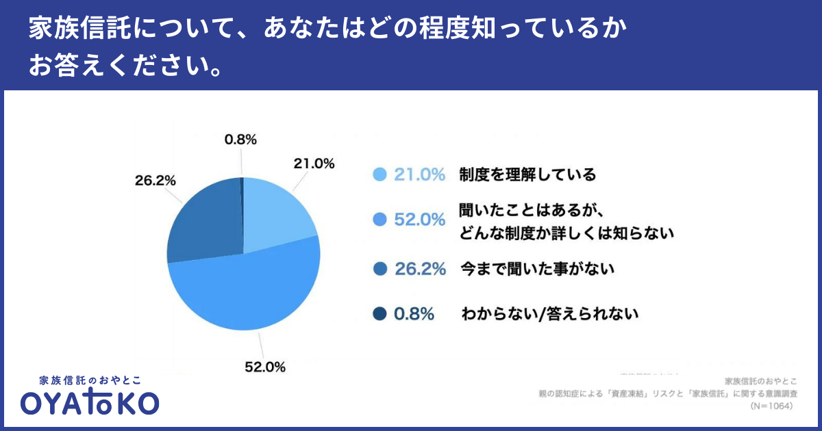 一方、「家族信託についてあなたはどの程度知っているかお答えください」(N = 1064) という質問に対しては、「制度を理解している」が21.0%、「聞いたことはあるが、どんな制度かは詳しくは知らない」が52.0%、「今まで聞いた事がない」が26.2%、「わからない/答えたくない」が0.8%という回答となった。
