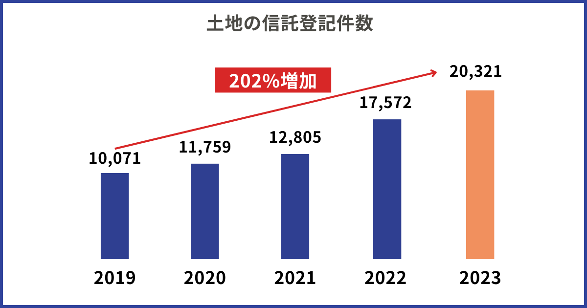 2023年の土地信託登記件数は20,321件と、昨年比116%の増加となった。