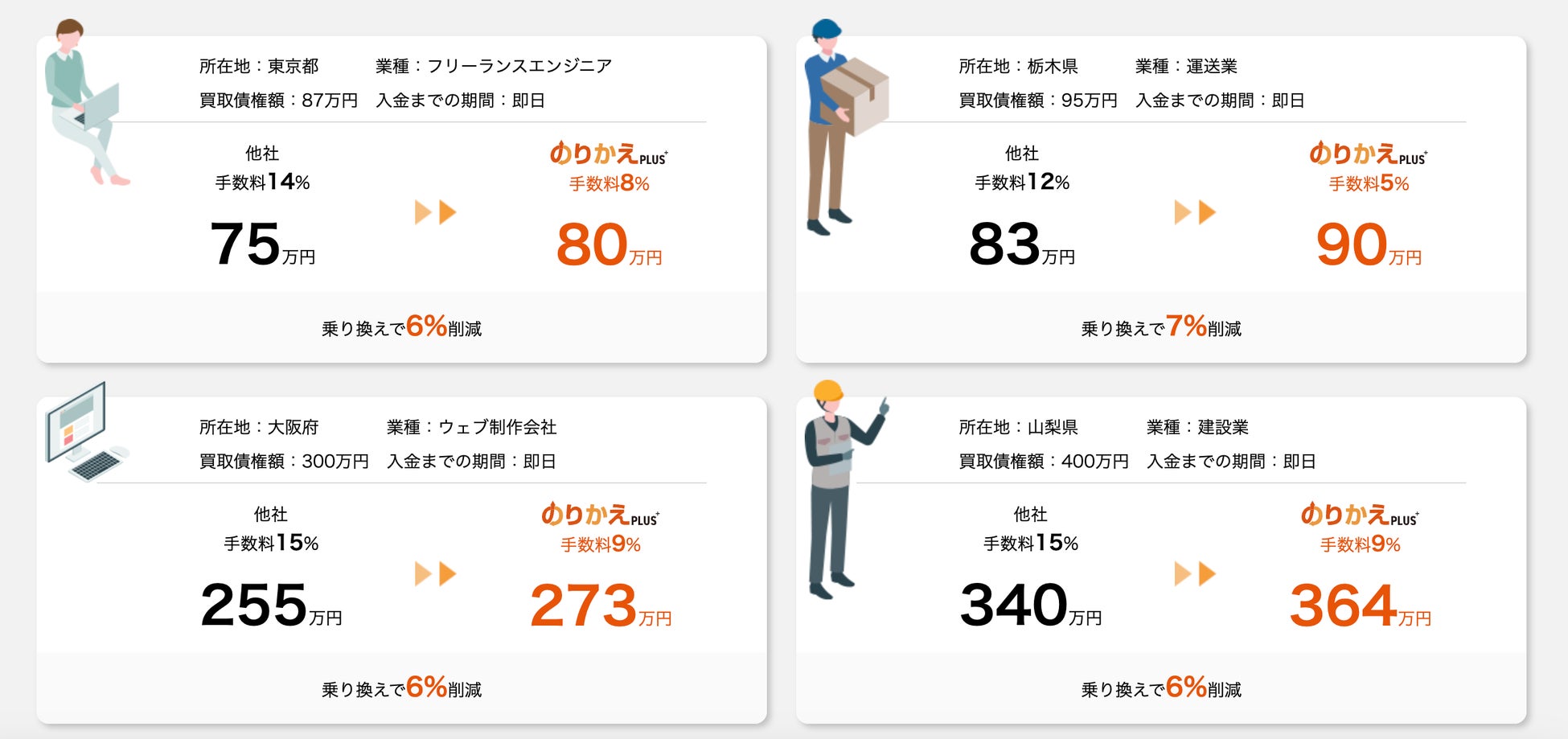 すでにファクタリング会社を利用している点を実績として評価する独自の審査で、一般的なファクタリング会社と比べ、低手数料、高価格買取を実現できる仕組みを構築。