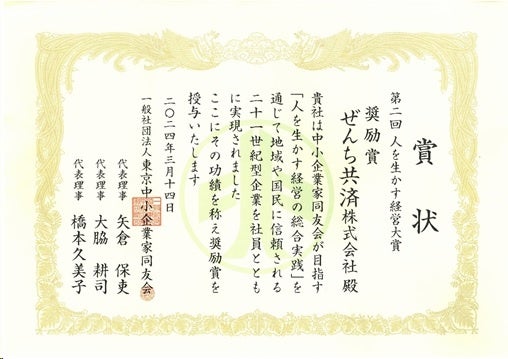 ぜんち共済株式会社(本社:東京都千代田区、代表取締役社長:榎本重秋)は、一般社団法人東京中小企業家同友会が主催する第2回『人を生かす経営』大賞において、「奨励賞」を受賞しました。